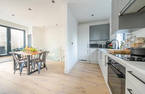 The top floor forms the heart of the home, with a generous open-plan kitchen, dining and living area that opens through bi-fold doors to a private terrace — an ideal spot for morning coffee or evening entertaining. Its layout feels more like a modern townhouse than a flat, creating a genuine sense of home and privacy rarely found in this price range.