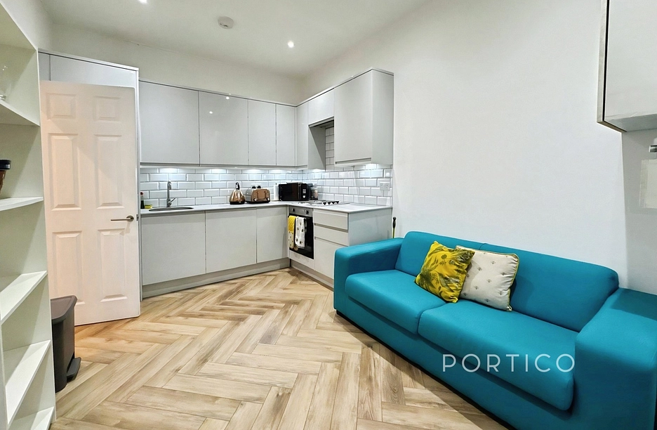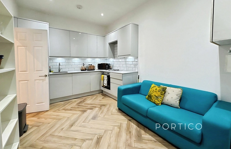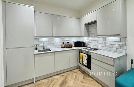 This bright and neatly arranged home offers a practical layout with a modern open-plan kitchen and reception area, finished with sleek white units, metro-tiled splashbacks and integrated appliances. The reception space is well-proportioned, flooded with natural light and features stylish herringbone flooring, creating a contemporary yet homely feel.